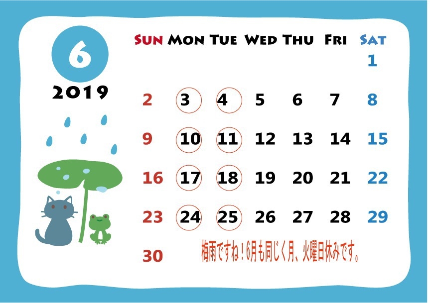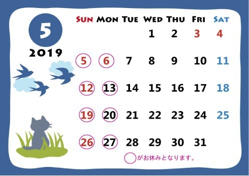 五月の休みも変わらず毎週月曜日と火曜日休みとなります。